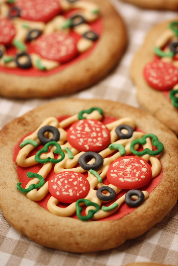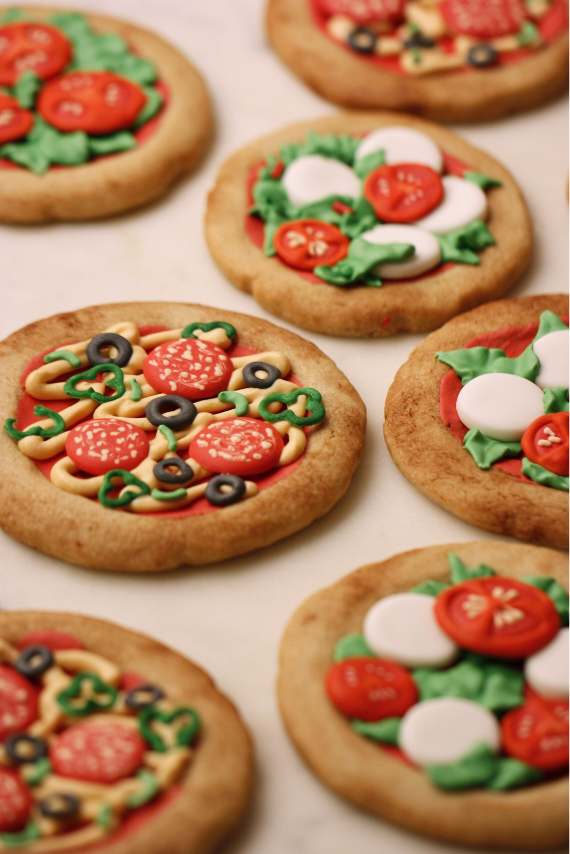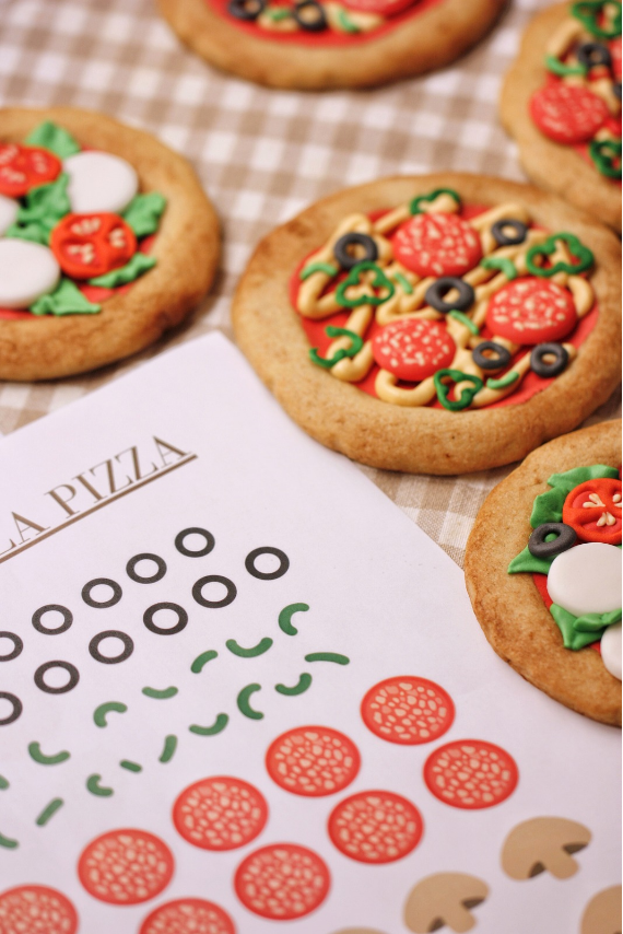 Unas deliciosas pizzas para merendar con nuevo sistema para decorar galletas de una manera mucho más fácil, mediante calco y transferencia.
